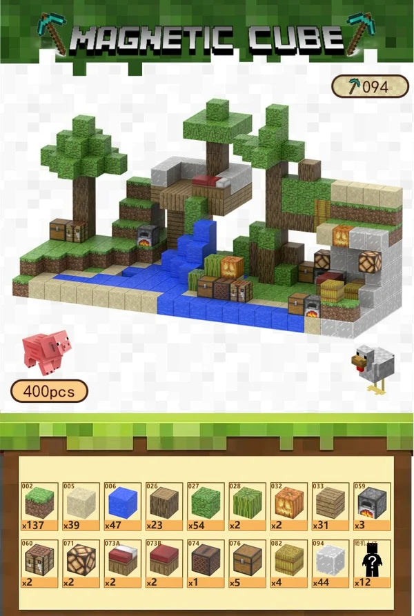 🏠 Indeholder 400 magnetiske byggeklodser – nemme at samle og skille ad🌴 Byg et træhus med seng, ovn, lamper og skattekister💧 Skab omgivelser med vandfald, sand og græs🐷 Indeholder 12 figurer (tilfældigt udvalg) – fx dyr, helte eller monstre⚒️ Passer perfekt med andre Magnetic Cube Minecraft-sæt