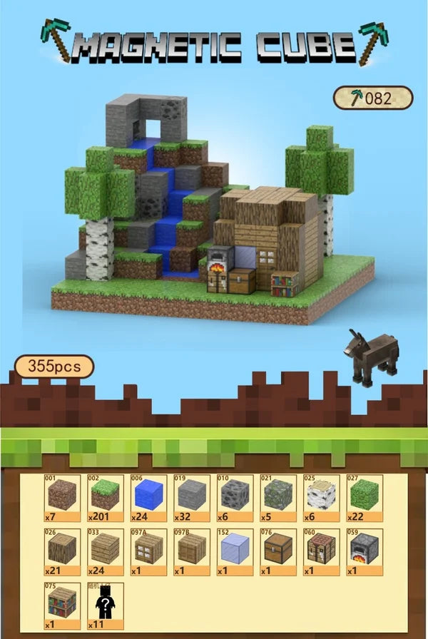 🏡 Indeholder 355 magnetiske byggeklodser – nemme at samle med stærke magneter🌊 Skab et smukt vandfaldslandskab med birketræer, sten og græs🪵 Byg et Minecraft-hus med dør, vinduer, ovn og kiste🐐 Indeholder 11 figurer (tilfældigt udvalg) – fx dyr, helte eller monstre⚒️ Kompatibelt med alle andre Magnetic Cube sæt