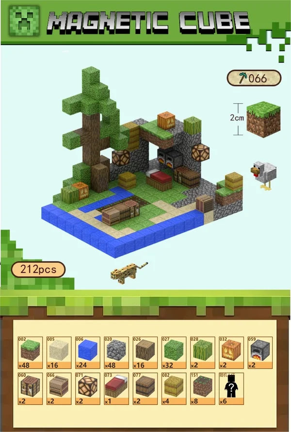 🧱 Indeholder 212 magnetiske byggeklodser🌲 Byg en skov med sø og naturinspirerede detaljer🏡 Inkluderer seng, arbejdsbord, tønder og ovne🐆 Leveres med 6 figurer (tilfældigt udvalg) – fx dyr eller karakterer✨ Klodser i realistisk Minecraft-stil⚒️ Kompatibel med alle andre Magnetic Cube byggesæt