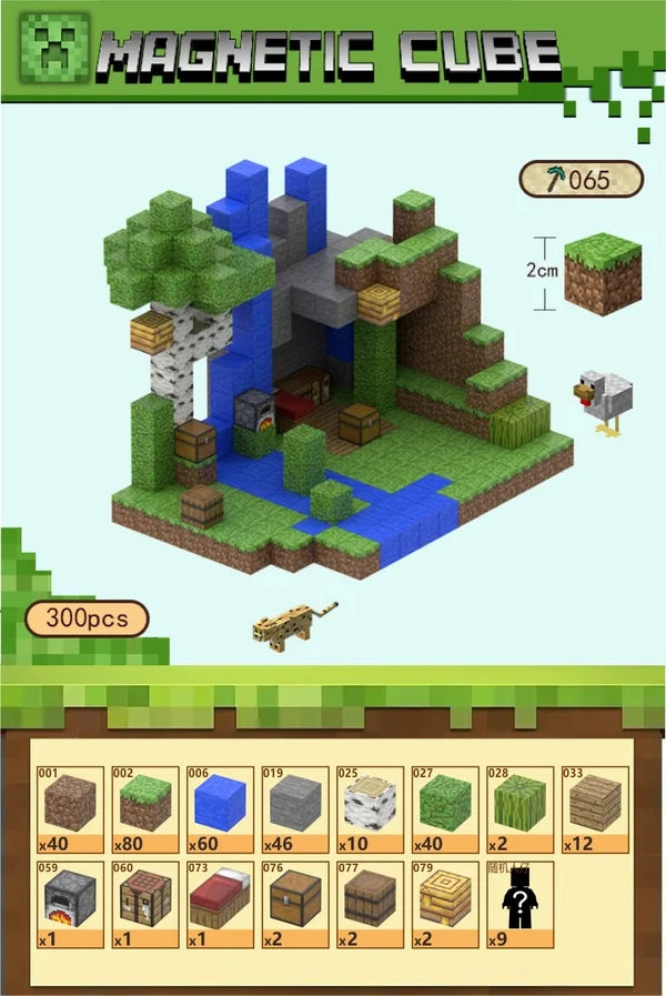🧱 Indeholder 300 magnetiske byggeklodser🌳 Byg en stor skovscene med træer, klipper og vandfald🏡 Indeholder seng, ovn, kister og arbejdsbord🐆 Leveres med 9 figurer (tilfældigt udvalg) – fx dyr eller karakterer✨ Klodser med realistiske Minecraft-teksturer for autentisk udseende⚒️ Kompatibel med alle andre Magnetic Cube byggesæt